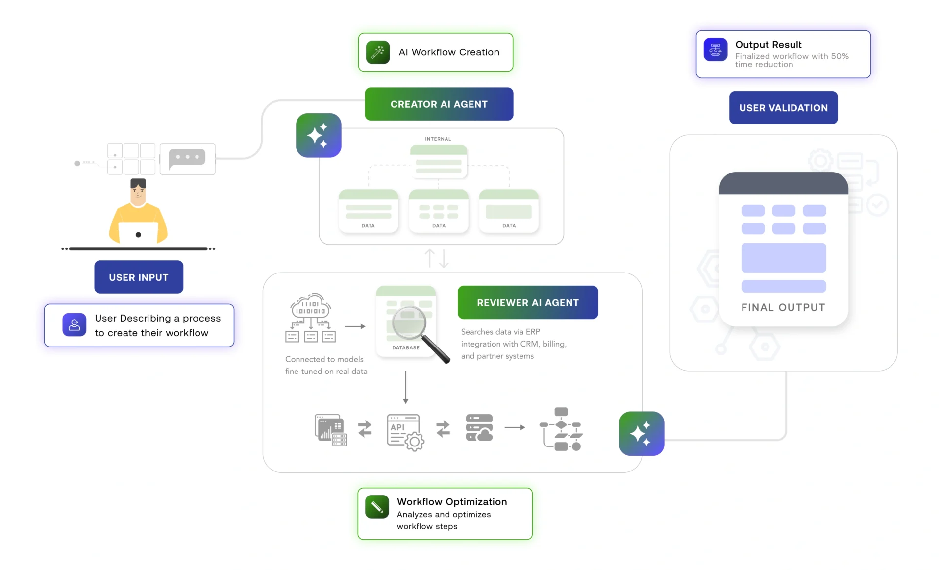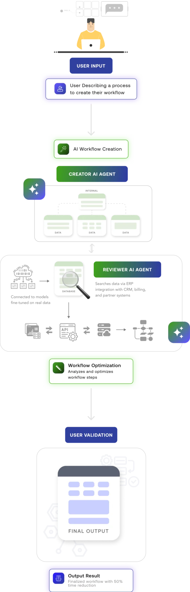 Describe your process, and our AI assistants modeled on real-work data will create the workflow for you.
